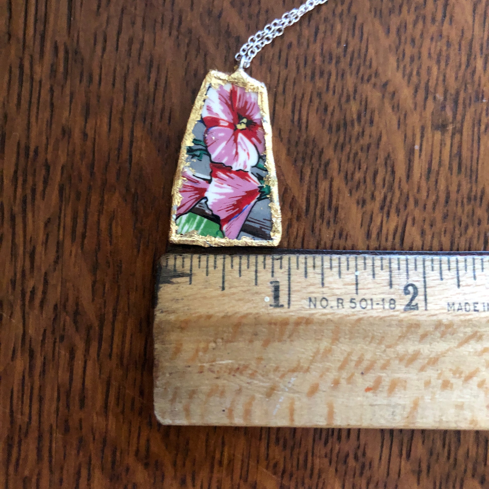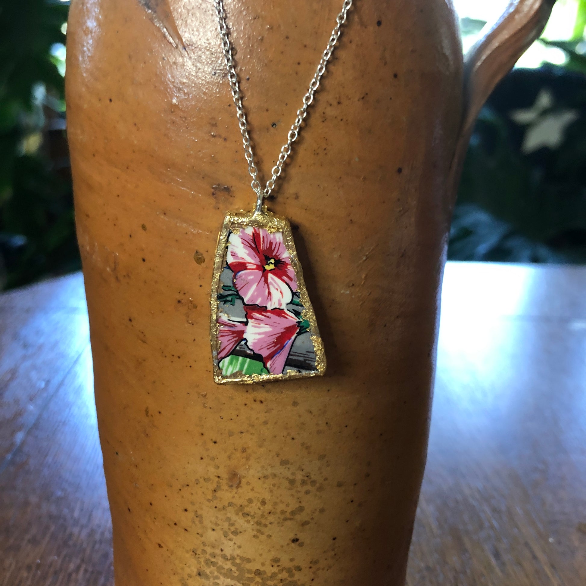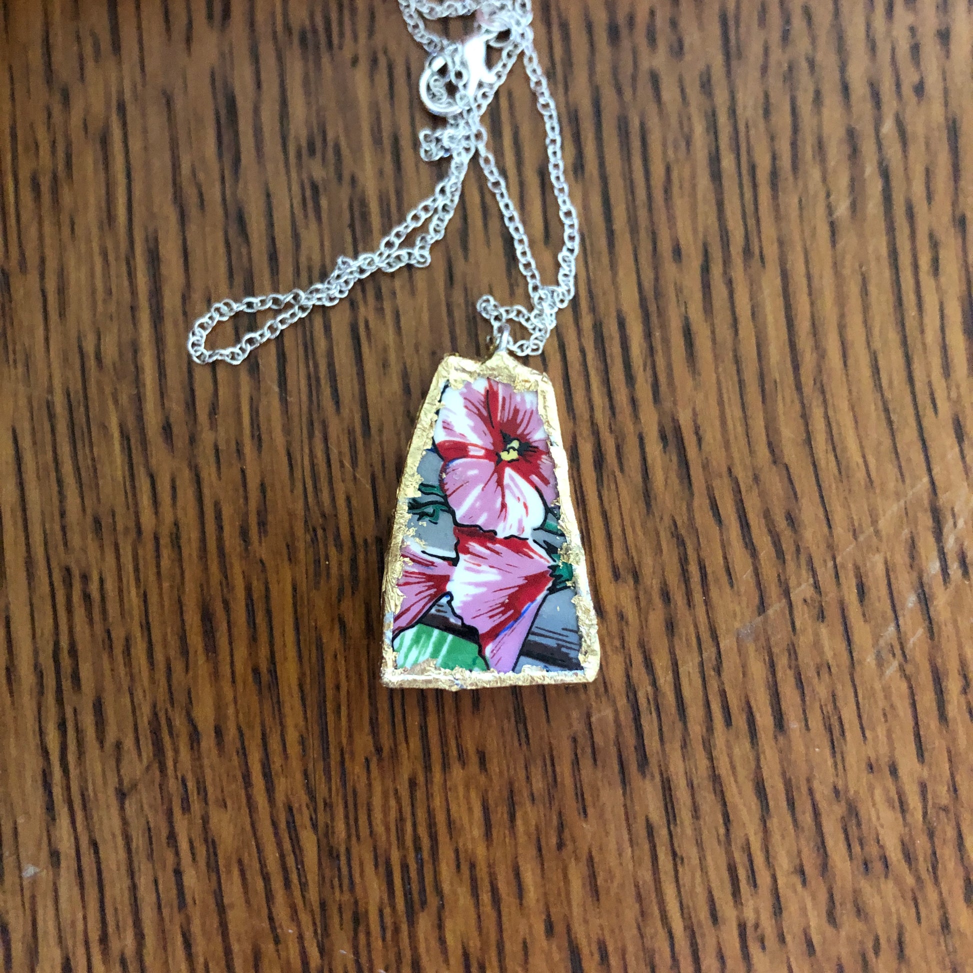 Add a playful touch to your style with this handcrafted pendant necklace featuring a broken Elvis collector plate, sized at 7/8 inch by 1.25 inches. This unique piece captures a fun spirit, making it a quirky and charming accessory for those who enjoy a dash of personality in their look.
